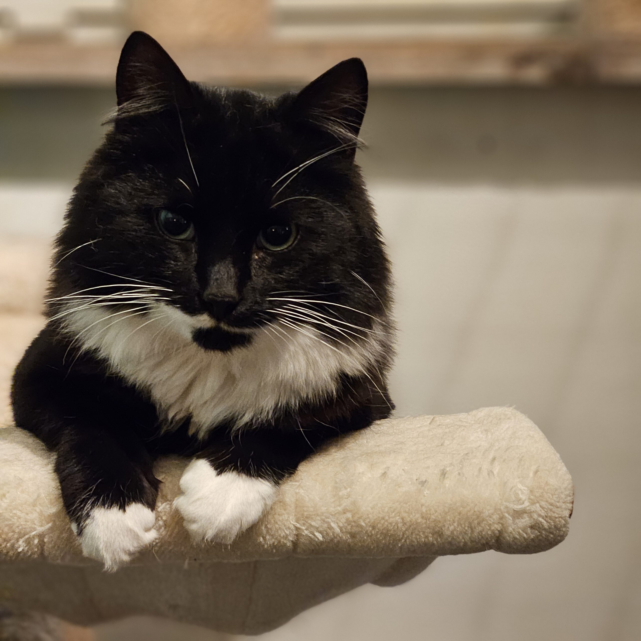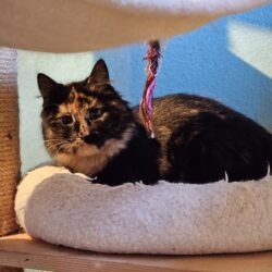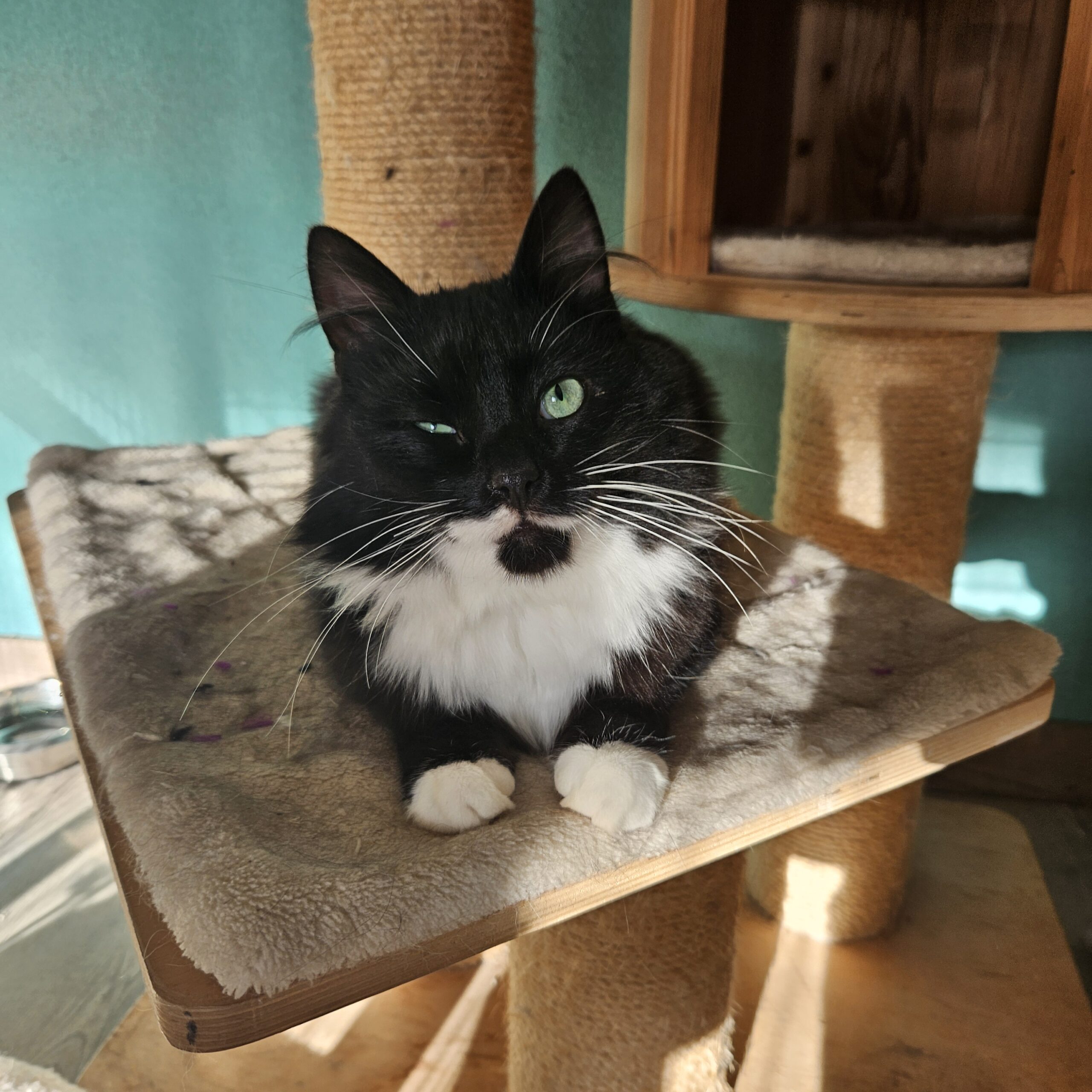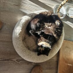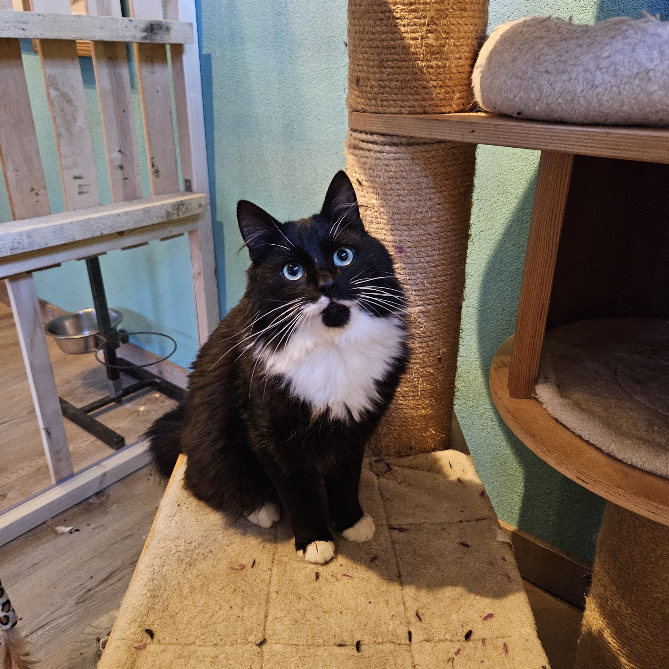 Is een hele lieve sociale kater die heel veel van knuffelen houdt. Zodra het gastgezin bij ze in de ren komen staat ie gelijk klaar om te knuffelen.