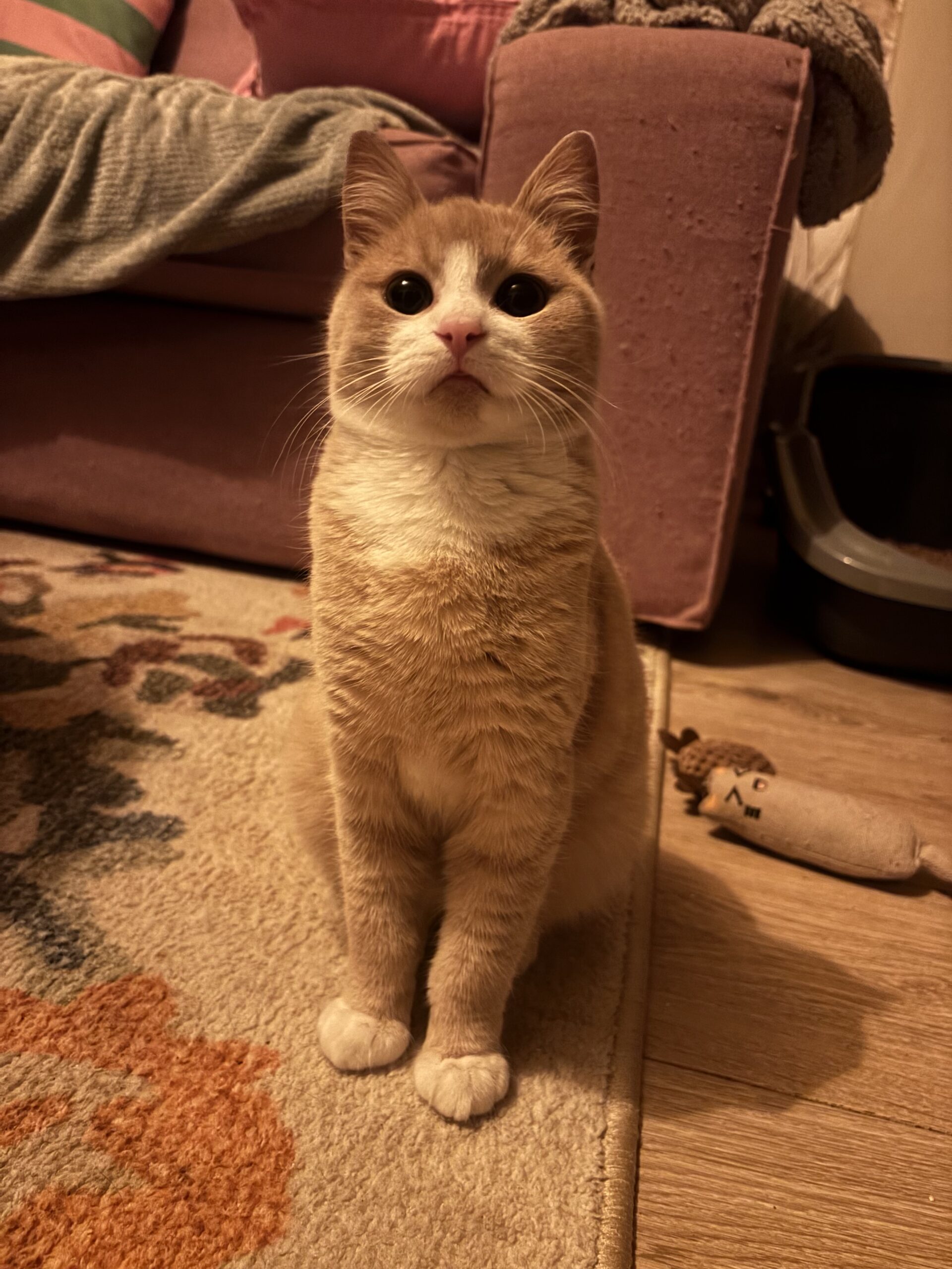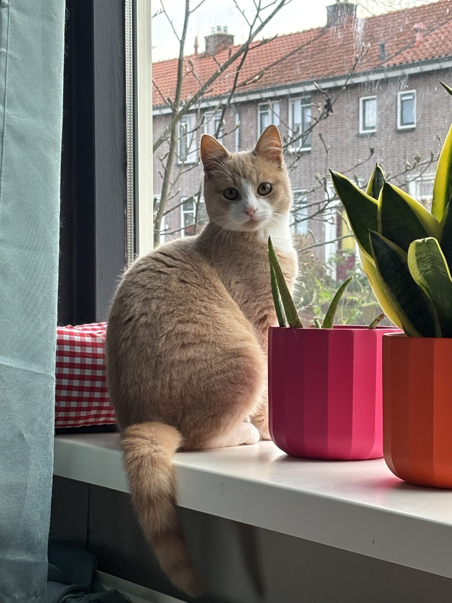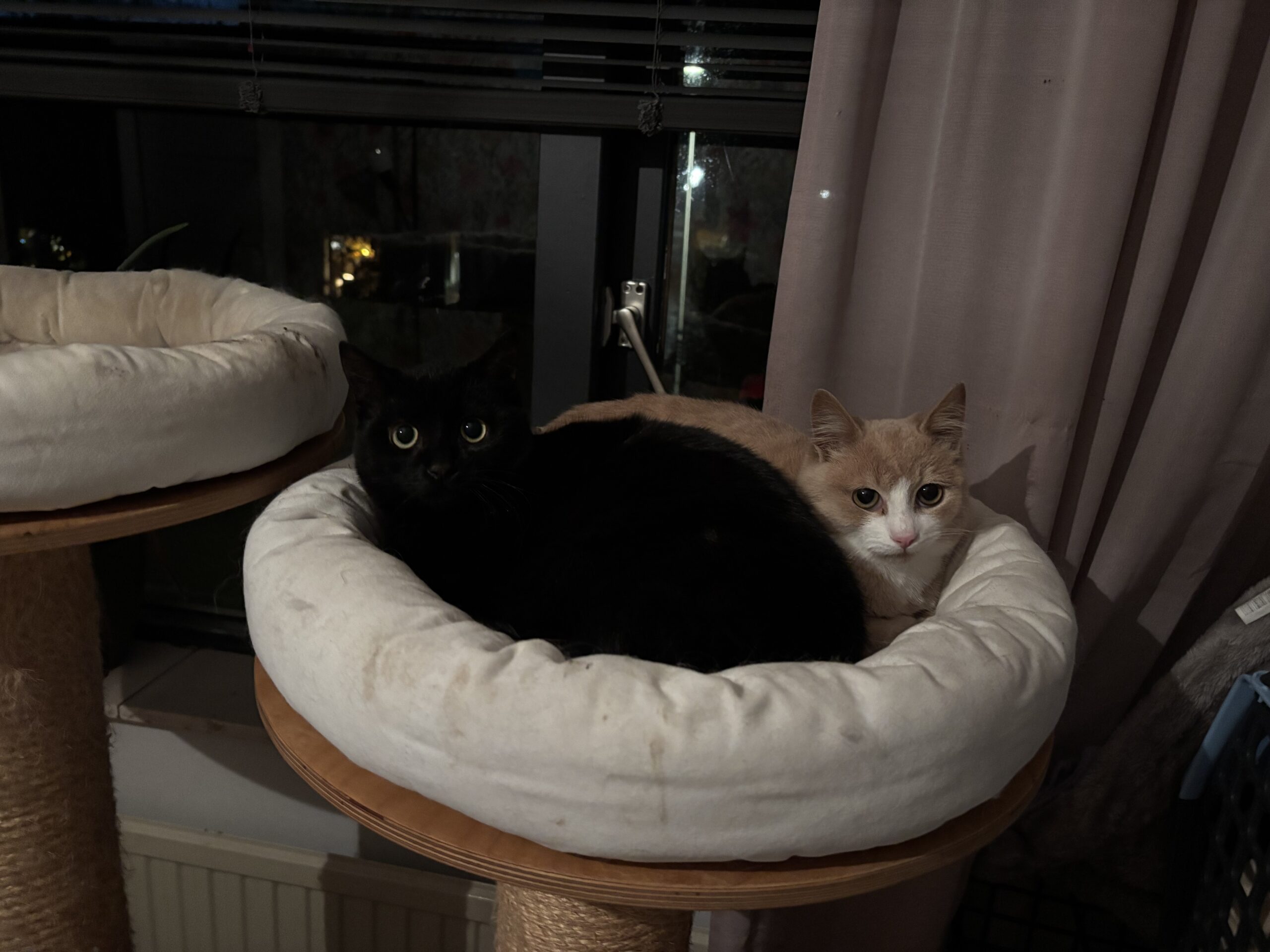 Stiekem zijn we best over te halen om in de buurt van het mens te komen hoor. Pak een paar snoepjes of een stick liquid snack en we staan naast (of bovenop) haar. We liggen eigenlijk altijd samen, in de krabpaal, in een mandje of op de bank en willen dus heel graag ons hele leven samen blijven knuffelen. Een nieuw huis zullen we eerst heel spannend vinden en bij, jonge, kinderen durven we ook niet zo goed te wonen. Dat wordt ons waarschijnlijk wat te druk. We willen het liefst lekker binnenkatten blijven zodat ons buiten niks kan overkomen. Buiten interesseert ons nu ook nog helemaal niks, lekker warm binnen bij de kachel vinden we veel leuker. Honden zijn we trouwens ook niet gewend. Maar met een goede gewenning periode kunnen we daar waarschijnlijk wel aan wennen. We zijn geen hele kleine kittens meer (geboren juli/aug 2025) maar naast de volwassen katten hier lijken we echt nog wel klein en zijn we heeeeeel schattig.