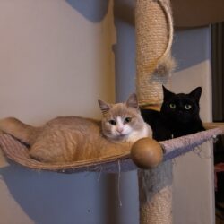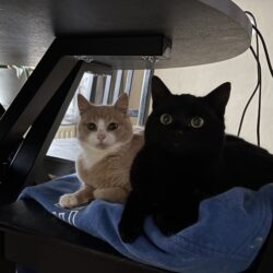 Hoi, wij zijn Archie (zwart) en Alvin (creme met wit). We zijn geboren op een manege en hebben daar de eerste weken van ons leven gewoond. Daar werden we gevangen bij een TNR actie maar omdat wij nog wel konden wennen aan het wonen in het huis zijn we in een gastgezin komen wonen (kop van Overijssel). Daar wonen 5 andere katten en 1 mens en daar moesten we best een beetje aan wennen. Aan de poezen niet hoor, die waren best leuk maar dat mens was best een beetje wennen.