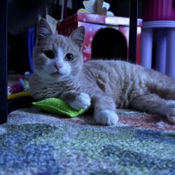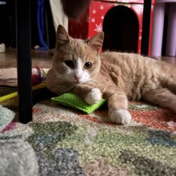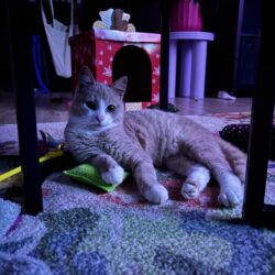 Ik, Alvin, kijk iets meer de kat uit de boom. Snoepjes vind ik heel lekker en miauwen kan ik ook heel goed, vooral als m’n broer even weg is. Maar aanraken moet ik nog wel aan wennen hoor. Als je me liquid snack geeft dan is kriebelen over m’n hoofdje goed maar verder wil ik niet zo graag geaaid worden. Ik vind het wel leuk om in de buurt te zijn van mijn pleegmama. Mijn hobby is televisie kijken. Vooral dierenprogramma’s vind ik heel erg leuk om naar te kijken. Ook speel ik heel graag met springveertjes en een piepmuis. Vind je trouwens niet dat ik een hele speciale kleur heb? Ik ben lichtrood met wit en volgens pleegmama heet dat creme. Nou dat klinkt best speciaal vind ik zelf.