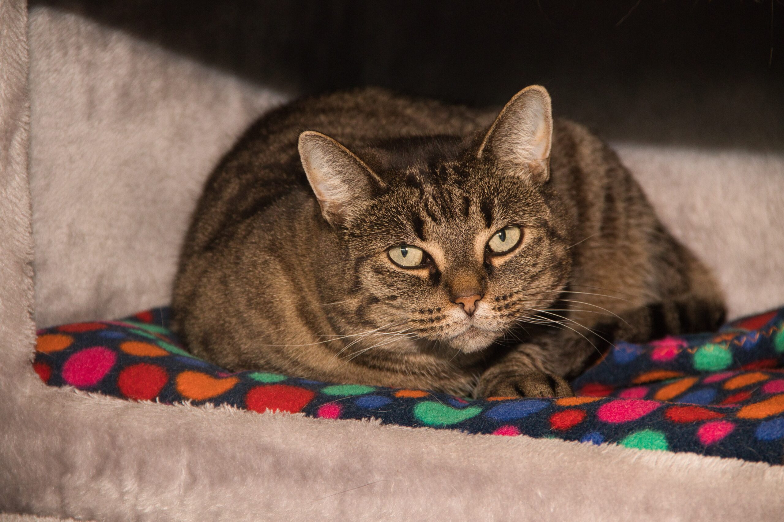 Zo kregen we eind december 2023 telefoon van iemand die wegens verslavingsproblematiek een half jaar opgenomen werd. Na dit half jaar zou hij begeleid gaan wonen waardoor de huur van zijn huidige woning stopgezet werd. Meneer had echter nog vier volwassen katten en twee kittens in huis lopen waar hij onderdak voor zocht. Het plaatselijke asiel wilde ze wel opnemen, maar dan moest hij afstandgeld betalen wat hij niet had. Wij zaten op dat moment overvol, maar hebben toch een oplossing kunnen bedenken. Wij hebben de katten allemaal gecastreerd/gesteriliseerd, gevaccineerd, gechipt en behandeld tegen vlooien en wormen. Doordat de katten nu ‘kant en klaar’ waren wilde het asiel bij meneer in de buurt ze alsnog opnemen. Toen ze bij ons kwamen voor hun behandeling zagen wij echter naast drie gezellige knuffelpoezen en twee kittens ook een hele schuwe poes. Deze poes woonde bij meneer in een gat in de muur en liet zich zelden tot nooit zien. Ze had niets met de andere aanwezige katten en was één bonk stress. Wij konden het niet over ons hart verkrijgen om ook deze poes naar een ‘gewoon’ asiel door te plaatsen, wetende dat ze hier waarschijnlijk heel lang zou moeten verblijven. We besloten dat ze beter af was in één van onze verblijven, die ingericht zijn op langdurige opvang.