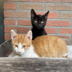 Samen met nog een broertje en onze mama zijn we bij Kat in Nood gekomen. Onze mama was niet zo gek op mensen, en dat had ze ons ook geleerd. Daarom vonden de mensen van Kat in Nood dat we in een gastgezin moesten wonen toen we oud genoeg waren om zonder onze mama te kunnen. Eerst vonden we die mensen maar gek hoor, maar inmiddels kan je daar niets meer van merken!